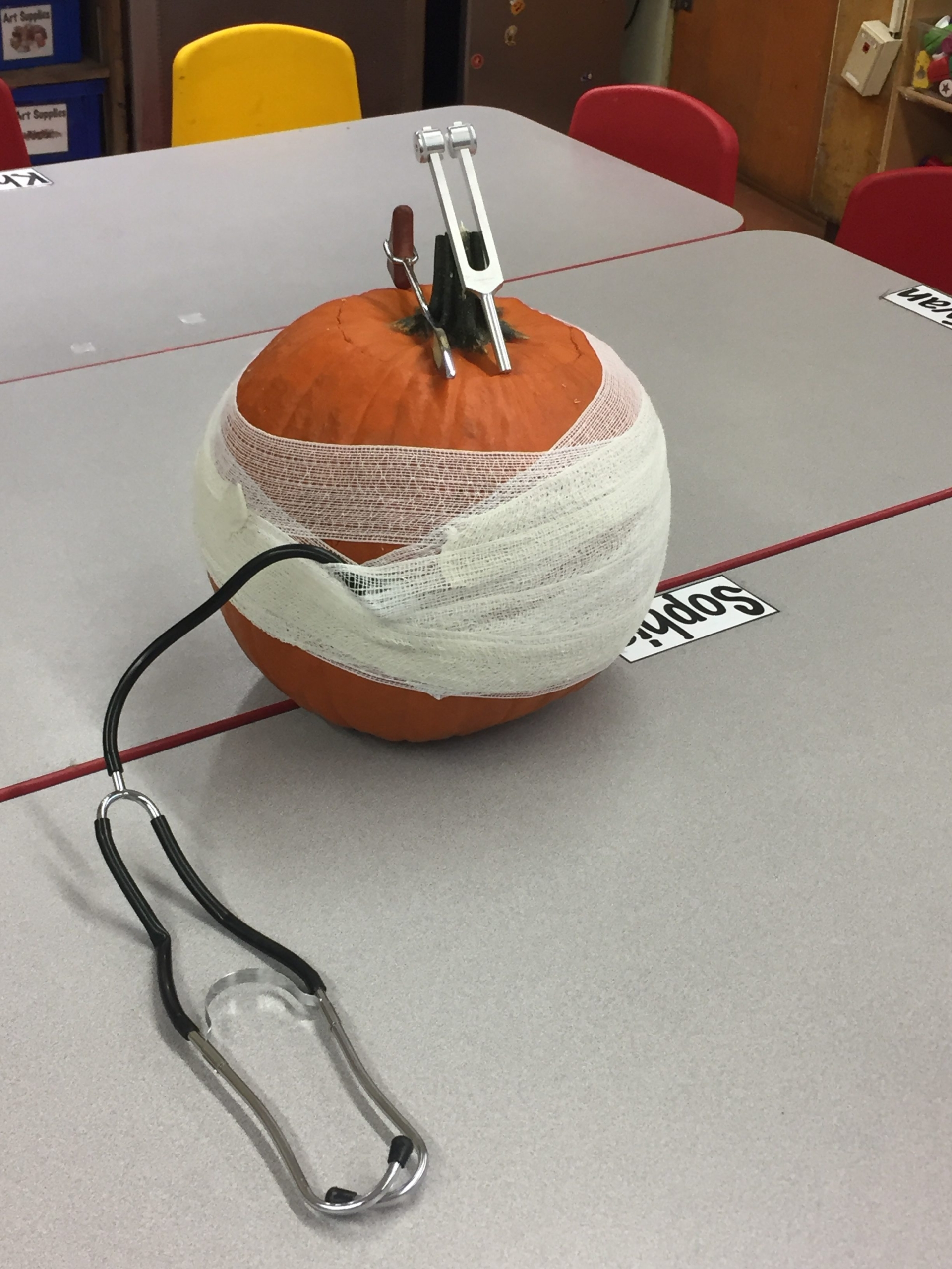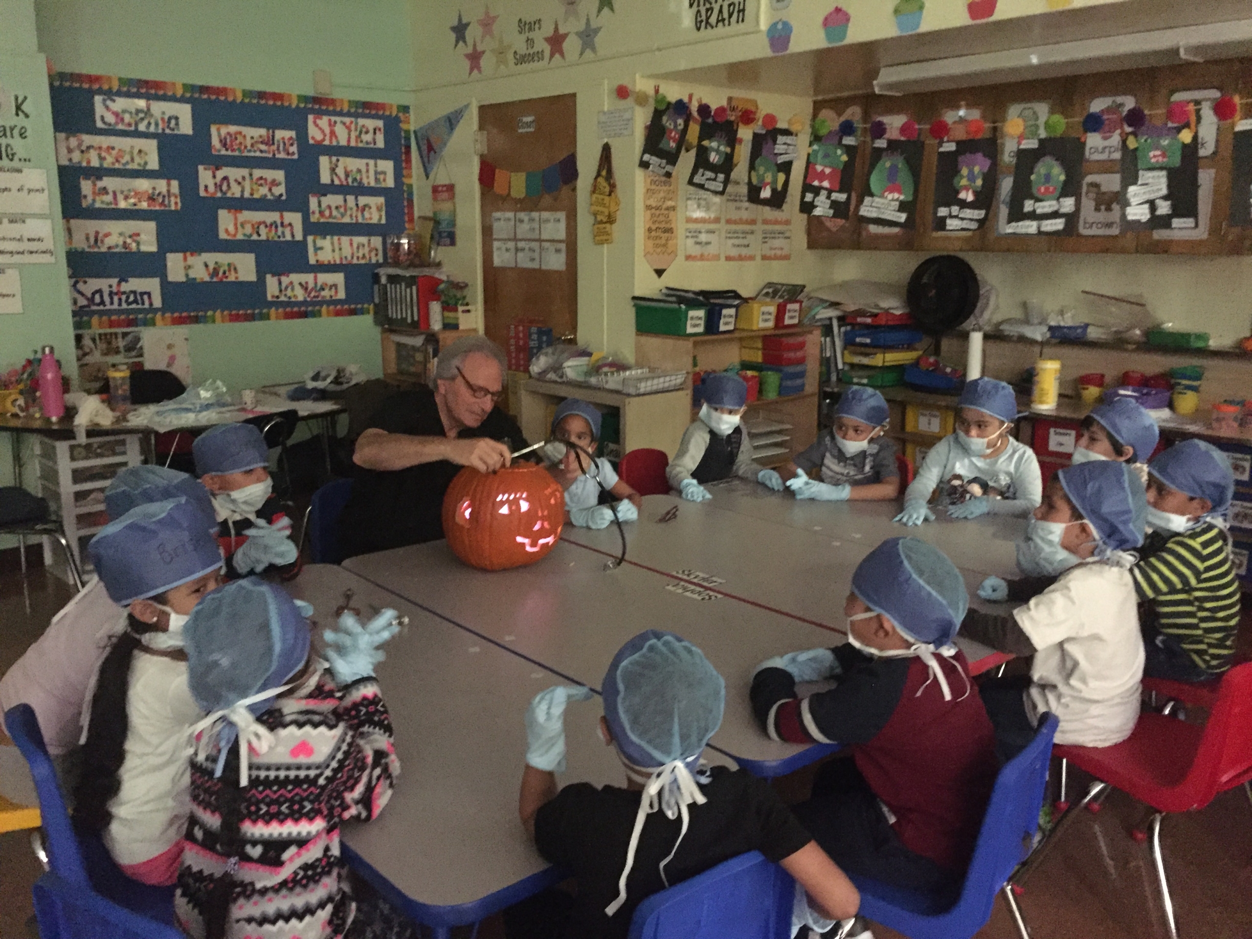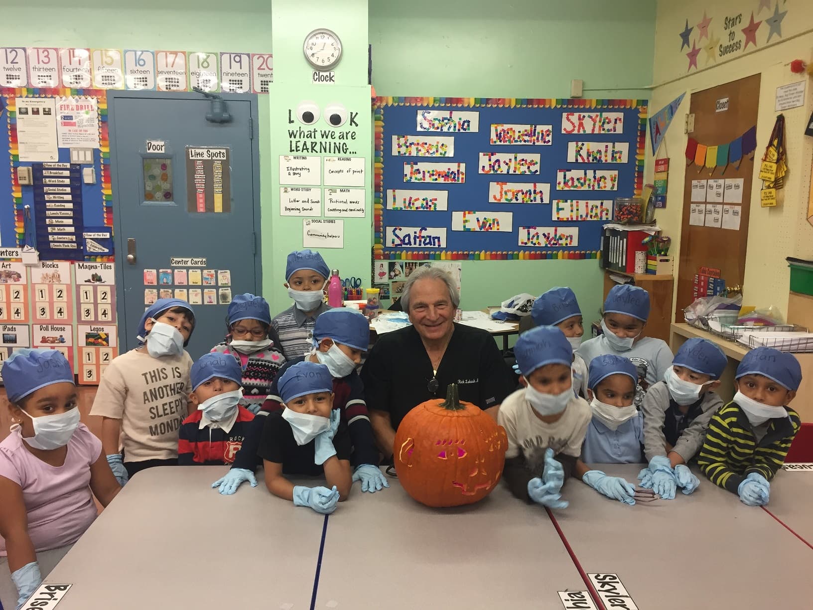 The students begin by suiting up in their surgical cap, rubber gloves, and mask, to prepare for the big “surgery” the same way that they would in the OR. For safety, Dr. Lukash pre-carves the pumpkin prior to the procedure and the kids participate in pulling out the pieces. Dr. Lukash’s visit is the Halloween highlight every year for these lucky students.