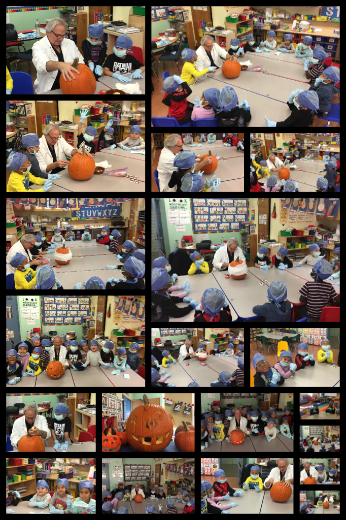 On Wednesday, all 16 children prepared for the big surgery by putting on a surgical cap, rubber gloves, and a mask, just like they would for the OR. Dr. Lukash pre-carves the pumpkin for safety, and all kids participate in pulling out the pieces. The “surgery” is the highlight of the day for this lucky kindergarten class.