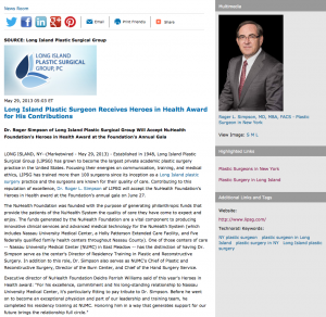 Long Island, NY – Established in 1948, Long Island Plastic Surgical Group (LIPSG) has grown to become the largest private academic plastic surgery practice in the United States. Focusing their energies on communication, training, and medical ethics, LIPSG has trained more than 100 surgeons since its inception as a Long Island plastic surgery practice and the surgeons are known for their quality of care. Contributing to this reputation of excellence, Dr. Roger L. Simpson of LIPSG will accept the NuHealth Foundation’s Heroes in Health award at the Foundation’s annual gala on June 27.
