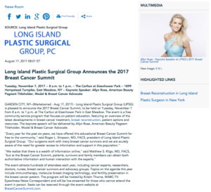 GARDEN CITY, NY – Long Island Plastic Surgical Group (LIPSG) is pleased to announce the 2017 Breast Cancer Summit, to be held on Tuesday, November 7 from 8 a.m. to 1 p.m. at The Carltun at Eisenhower Park in East Meadow. The event is a free community service program that focuses on patient education, featuring an overview of the latest developments in breast cancer treatment, breast reconstruction, patient options and resources. The keynote speech will be delivered by Allyn Rose, American Beauty Pageant Titleholder, Model & Breast Cancer Advocate.