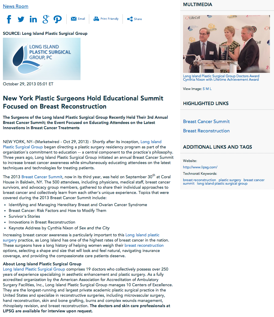 The surgeons of the Long Island Plastic Surgical Group recently held their 3rd annual Breast Cancer Summit. The event focused on educating attendees on the latest innovations in breast cancer treatments. New York, NY – Shortly after its inception, Long Island Plastic Surgical Group began directing a plastic surgery residency program as part of the… Continue Reading