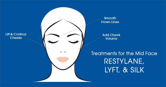 The mid face refers to the tear trough, upper nasiolabial folds, and the lips. While Sculptra works well for the frame of face — the temples, lateral cheek, and jawline – Restylane Lyft works well for deep tissue injection in the cheek/cheek bone area to further accentuate the “inverted cone of youth.” Restylane Lift has the patented Non-Animal Stabilized HA (NASHA)TM technology. NASHA technology creates a firmer gel texture for a more pronounced lifting capacity. I prefer to use Restylane Silk for the tear trough area to fill in the hollow under the eyes.