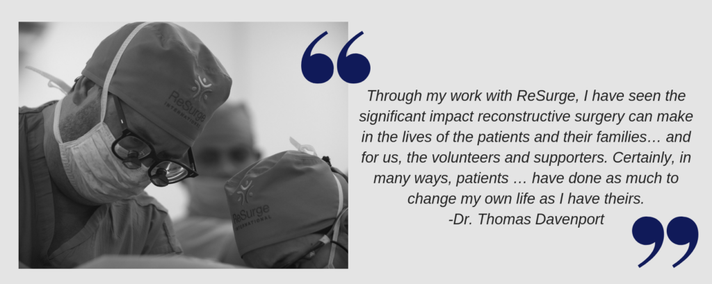 Since then, Dr. Davenport has been elected a member of the ReSurge Board of Directors and has continued to volunteer on ReSurge mission trips. He not only provides surgical care to patients who are suffering from injuries that limit their mobility, basic capacity, or ability to work, but also shares his experience and expertise with the local medical staff to improve the community’s medical capabilities.
